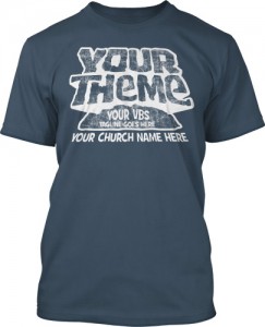 With this Off The Map T-shirt that is completely customizable, you can put your VBS theme or verse on your shirt. Or if you want it printed on a red shirt, we can also do that. Call us and let us know how you want this customized.