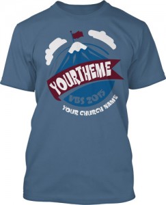 This shirt design totally screams, “We had fun at Vacation Bible School!" The kiddie sketches of clouds and the mountain are refreshingly attractive. You may get this customized for your 2015 VBS theme at no extra charge. You can also save by having this design printed in just one color. Phone us or fill-out the form below and our team of fun designers will get in touch with you.