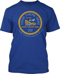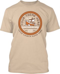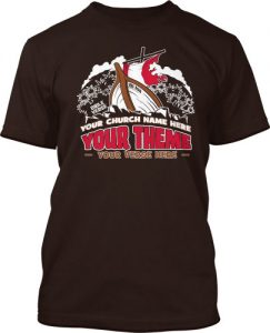 Get stranded in this cool dark chocolate, shipwreck island themed t-shirt design for Vacation Bible School 2018. Your VBS kids will love wearing this shirt that declares no matter what happens in life, Jesus is there to rescue. Customize the colors and shirt style, plus your theme, verse, and church name. Go custom!