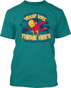 Yo ho! It's a Parrot's life for me. Join this squawking sidekick for the funnest Vacation Bible School ever! Whether your VBS kids are trekking through the jungle or trying to get off this island, they'll love their cute little buddy on their t-shirt. Customizable and easy to order. Choose your theme, verse, and church name to make it all your own.