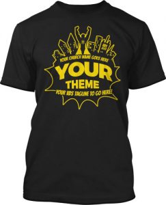 Calling all heroes! VBS is coming soon and this hero needs every team player he can get. He's stopping by so ready your team with some new shirts. Add your theme and church name just so this hero knows who to recruit first.
